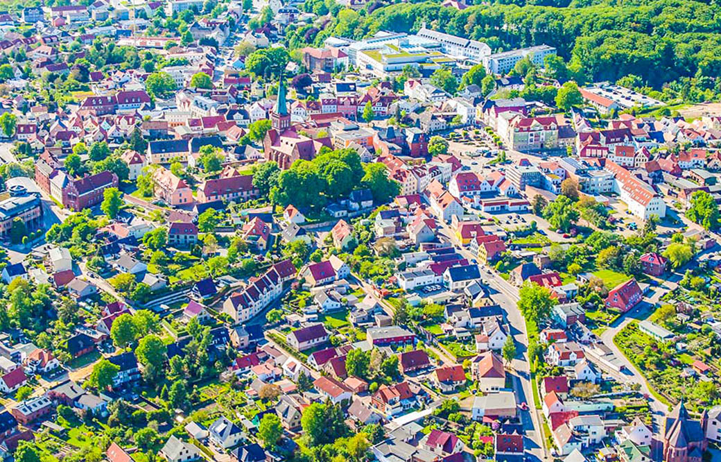 Luftbild vom Zentrum von Bergen auf Rügen. Von links mit Sparkasse, Gericht, Klosterhof, Kirche, Post und Rathaus.