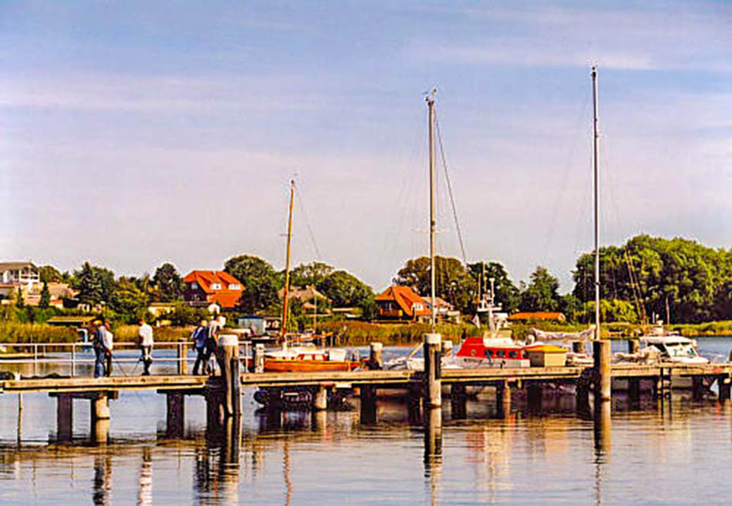 Vom Hochufer Blick auf die Seebrücke über die Ostsee bis Jasmund Kreideküste.