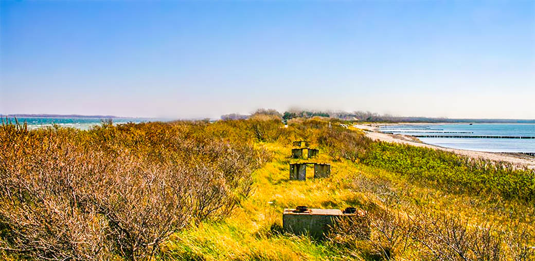 Die schmale Landzunge in Dranske zwischen Wittow und dem Bug, Ostsee und dem Bodden.
