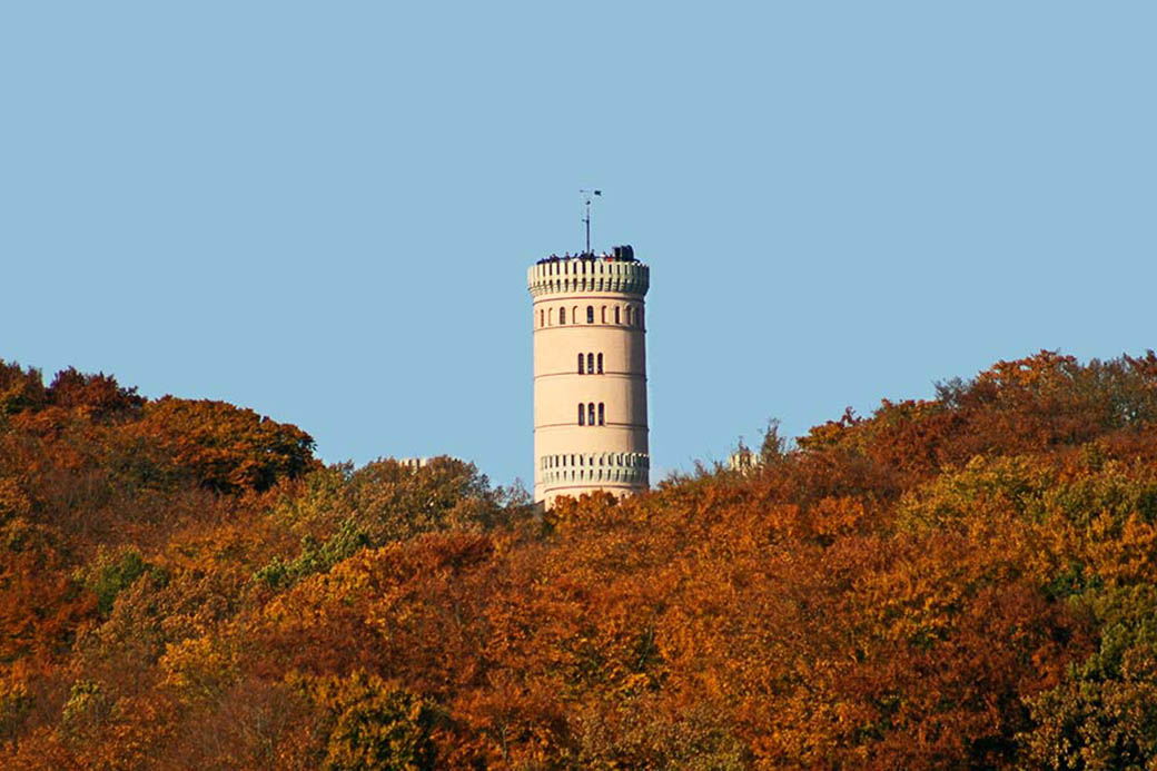 Der Turm des Jagdschlosses Granitz im bunten Herbstlaub.