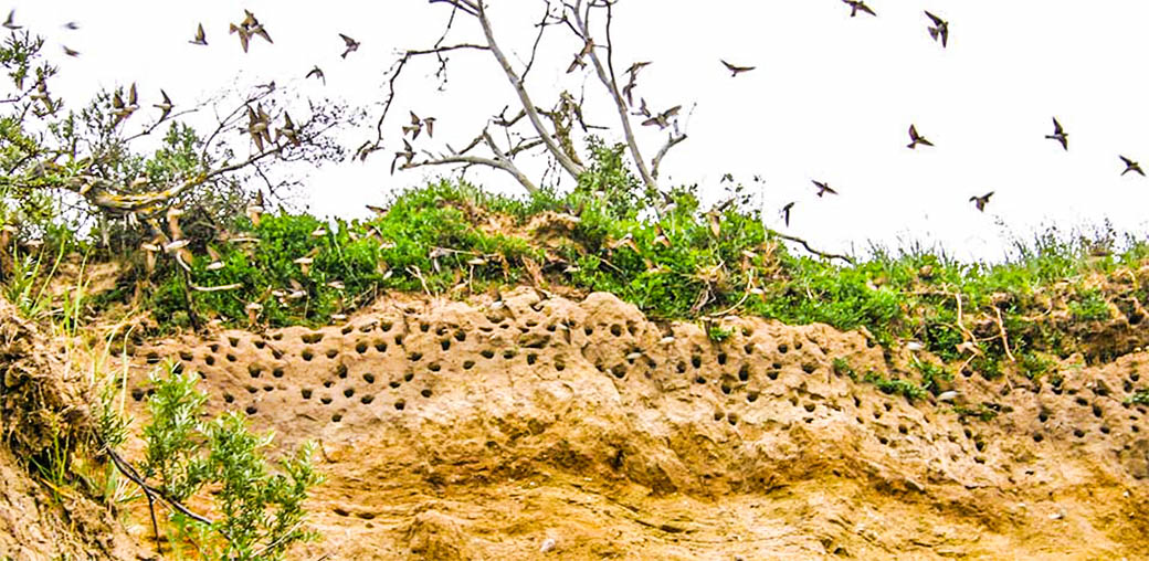 Strandschwalben mit Bruthöhlen am Steilufer von Klein Zicker.
