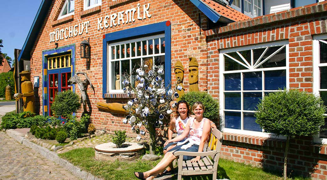 Urlauber vor der Mönchgut Keramik in Middelhagen.