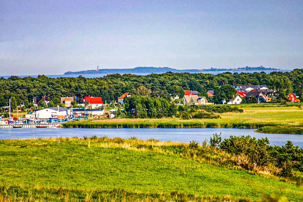 Der Thießower Hafen auf Mönchgut. Am Horizont die Insel Greifswalder Oie.