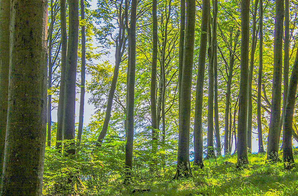 Nationalpark Jasmund: Frisches Grün im frühlingshaften Buchenwald am Hochufer der Kreideküste.