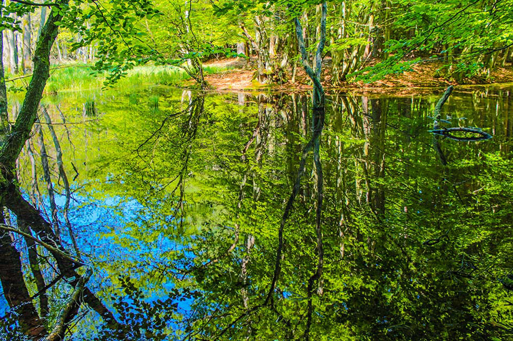 Nationalpark Jasmund: Die Bäume spiegeln sich im ruhigen Wasser des Moorteiches.