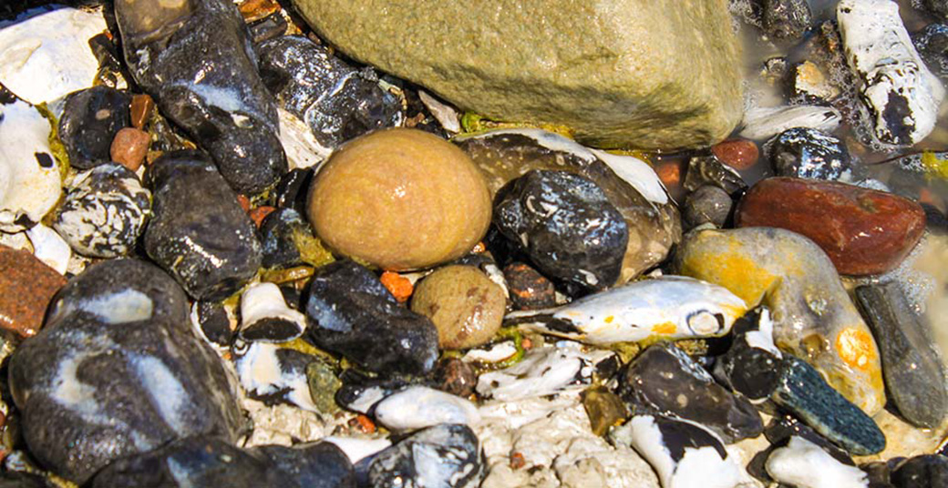Die bunten Farben der nassen Steine an der Kreideküste.