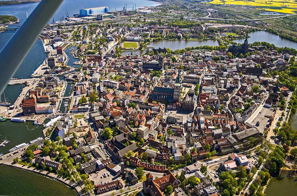 Rundflug: Die UNESCO-Weltkulturerbe Altstadt von Stralsund.