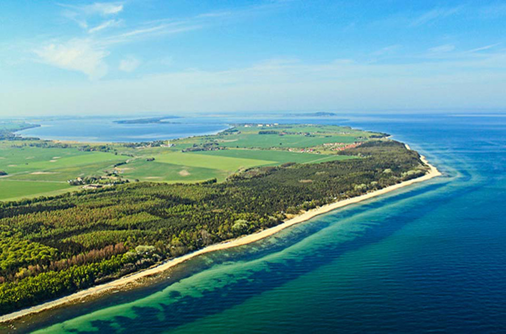 Rundflug: Das Nordufer von Wittow. Richtung Dranske mit Bug und Hiddensee.