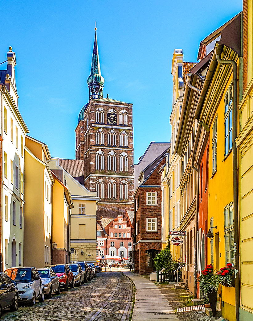 Hansestadt Stralsund: Blick von der Altstadt auf den Alten Markt mit der Nikolaikirche.