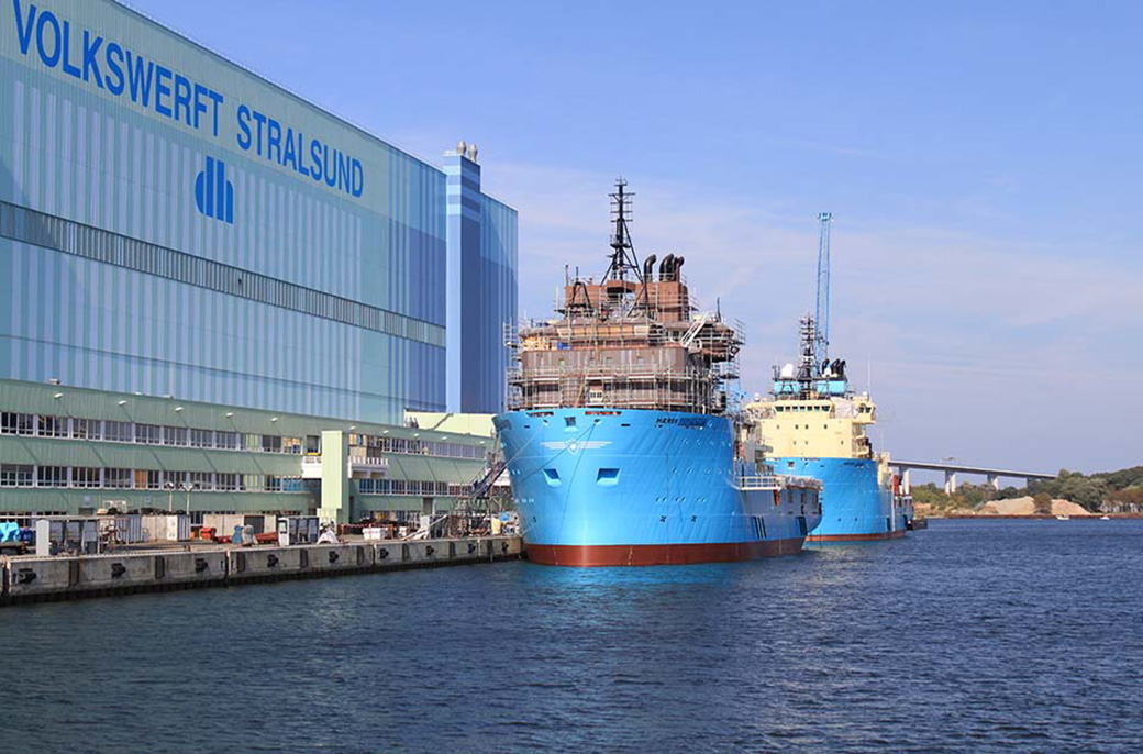 Hansestadt Stralsund: Die Volkswerft mit zwei Fähren am Ausrüstungskai.