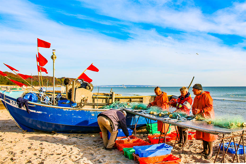 Frühmorgens pulken die Fischer ihren Fang aus den Netzen. Fischerstrand in Baabe.