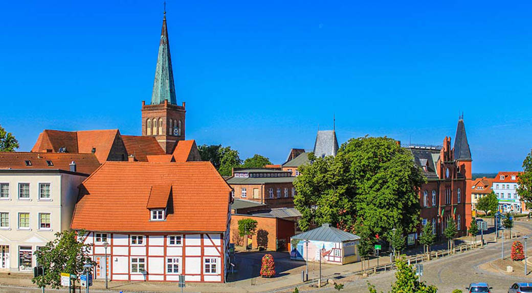 Der Markt in Bergen mit dem Benedikthaus, rechts die Post und im Hintergrund die St. Marienkirche.