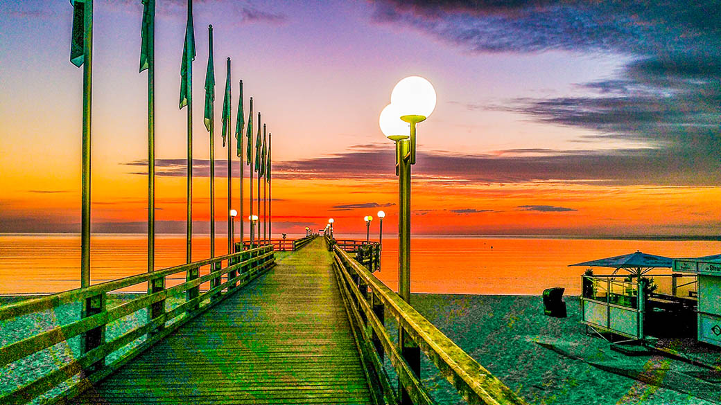 Sommerlicher Sonnenaufgang an der Seebrücke im Ostseebad Binz.
