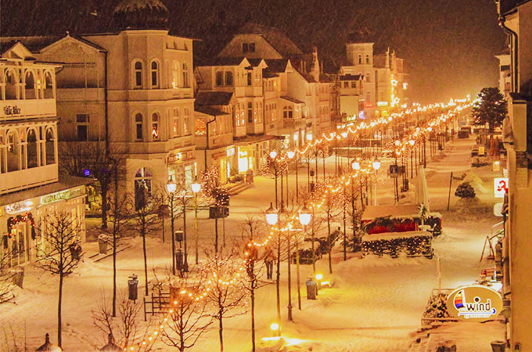 Die weiß verschneite Binzer Hauptstraße in festlicher Weihnachtsbeleuchtung.
