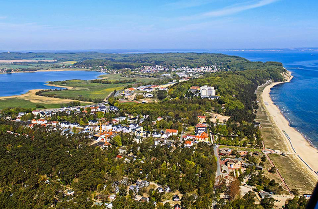 Luftaufnahme vom Nordperd mit dem vorgelagerten Bollwerk bis hin zum Ostseebad Göhren.