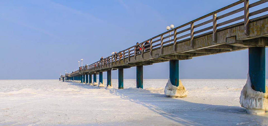 Die zugefrorenen Ostsee an der Seebrücke in Binz.