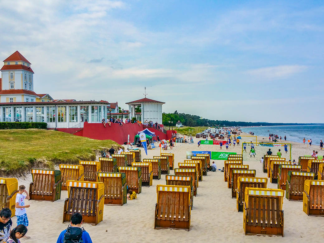 Der aufgeräumte Binzer Strand mit dem Sportstrand am frühen Morgen.