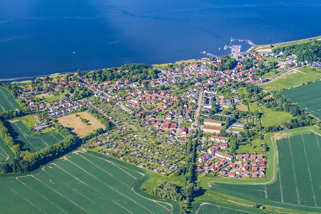 Das Nordufer ist durch eine Flachwasserzone mit Rügen verbunden.