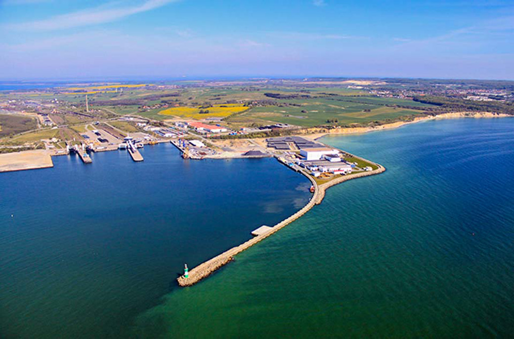 Rundflug: Mukran Mole, Fischfabrik und Fährhafen.