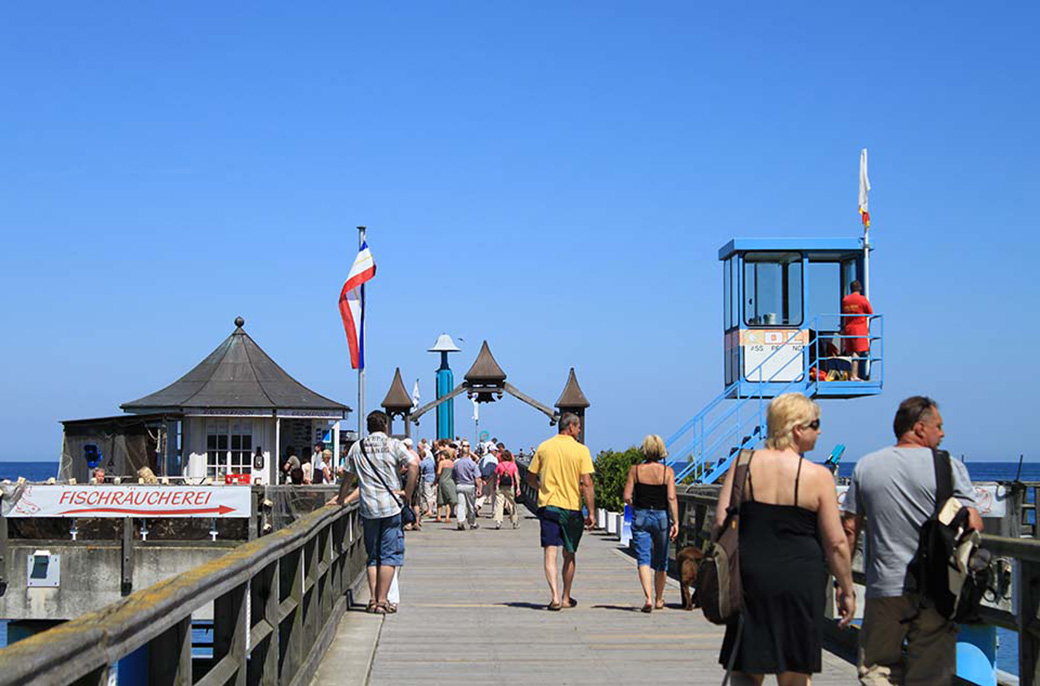 Luftaufnahme des Ostseebades Göhren mit Hotelanlagen, Strand und Seebrücke..